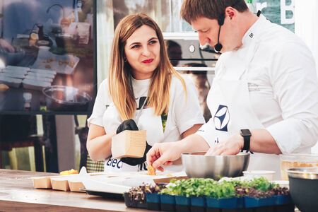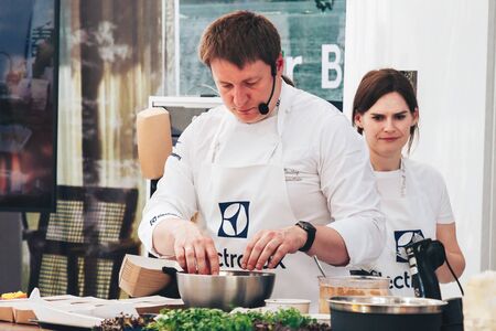 June 1, 2019 Minsk Belarus Public demonstration of cooking on the street A chef at a Swedish company shows how to prepare food at a master class. A smiling female assistant stands nearby.