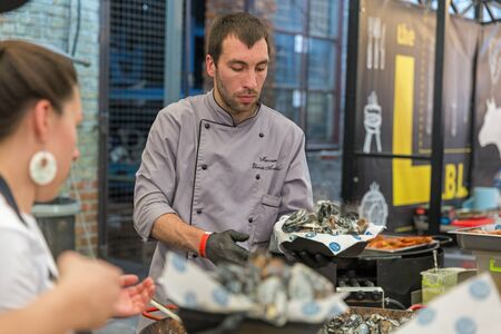 KYIV, UKRAINE - MAY 18, 2019: Chef presents cooked mussels at Kyiv Beer Festival vol. 4 in Art Zavod Platforma. More than 60 craft beer breweries were presented here.