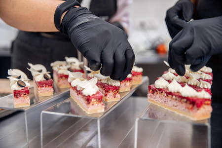 Close-up of chef in protective gloves decorating the delicious dish on the table before serving at the restaurant