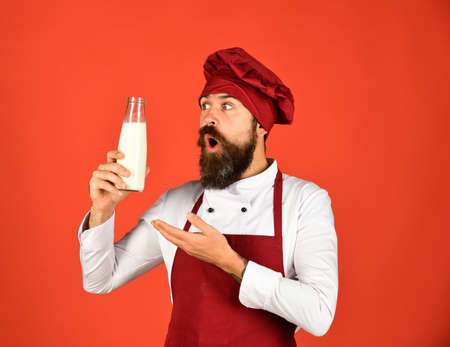 Cook with surprised face in burgundy uniform holds milk.