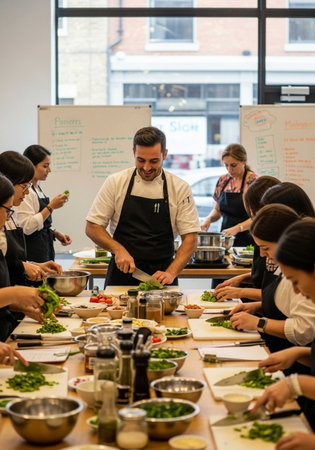 Cooking Class: Participants gather in a well-equipped kitchen, learning new culinary skills from a seasoned chef.
