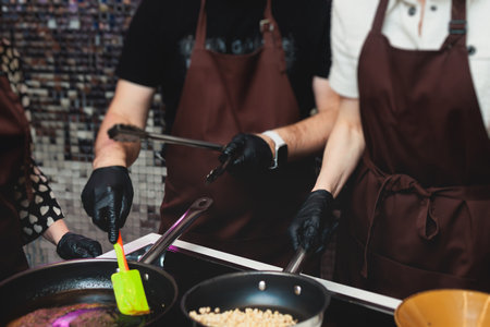 Group of guests in a cooking class studio, adults preparing different dishes in the kitchen together, people in aprons learn on culinary master class, chef uniform, hands in gloves, Italian cuisine