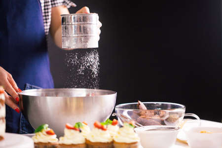 Close up of woman s hands sifting white flour to the bowl on black background.