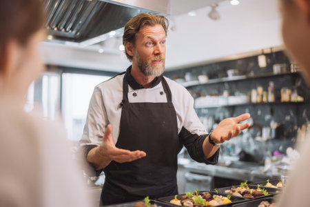 A culinary expert explains various cooking methods to a group of eager students in a contemporary kitchen. The session focuses on meal presentation and plating skills.