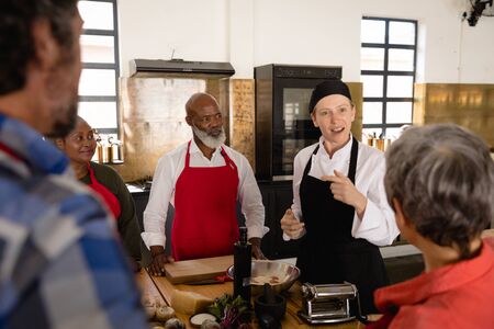 Front view of a multi-ethnic group of Senior adults at a cookery class, the diverse adult students listening to instructions from a Caucasian female chef wearing chefs whites and a black hat and apron, standing and making fresh pasta with a pasta machine, a wooden table of ingredients in the foreground