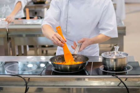 Chef hands holding silicone spatula and cooking vegetables - sliced bell pepper and onion in frying pan with oil on electric stove - front view. Professional cooking, gastronomy and food concept