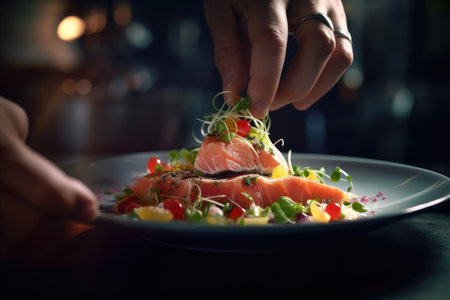 A chef delicately places garnishes on a plate, featuring a beautifully presented dish. The composition highlights vibrant colors from the food, set against a blurred restaurant interior. The lighting emphasizes detail, suggesting culinary expertise, suitable for editorial and commercial use, such as food industry content.
