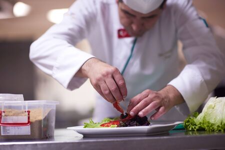 chef in hotel kitchen preparing and decorating food, delicious vegetables and meat meal dinner