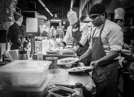 Milan, Italy - March 23, 2016: Chefs prepared the mail courses in the italian restaurant in Milan, Italy
