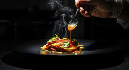 Professional chef gloved hands carefully drizzling rich sauce onto a steaming, perfectly plated gourmet lasagna, adorned with fresh basil leaves on a dark plate.