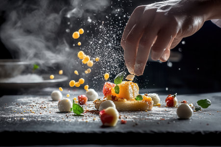 A skilled chef carefully sprinkles fresh herbs over a colorful platter, showcasing a blend of textures and flavors. The kitchen atmosphere buzzes with excitement and artistry.