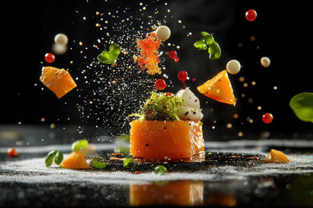 A dynamic shot of a gourmet dish being garnished with flaky sea salt, adding a finishing touch to a beautifully plated meal.