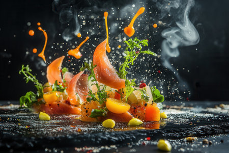 Spicy, colorful, plated dish with fresh herbs, vegetables, and seafood, with smoke and splashes.