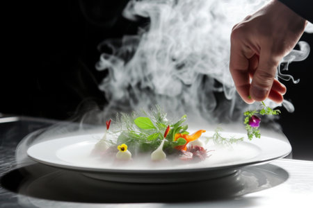 A talented chef meticulously garnishes a gourmet dish with fresh herbs and colorful ingredients, showcasing artistry in modern cuisine and culinary excellence.