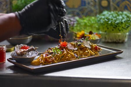 Food concept. The chef garnishes with red caviar a seafood spaghetti dish. Selective focus. Shallow depth of field.