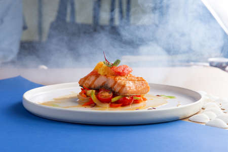 Salmon steak on a vegetable pillow. In a plate. Selective focus