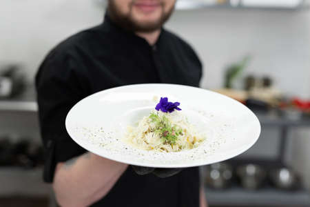 Food concept. The chef is decorated with fresh herbs and flowers dishes in the restaurant. The process of making spaghetti with seafood.