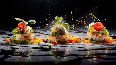 food stylist arranging culinary creations on white plate with black background, created with generative ai