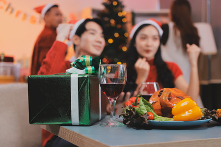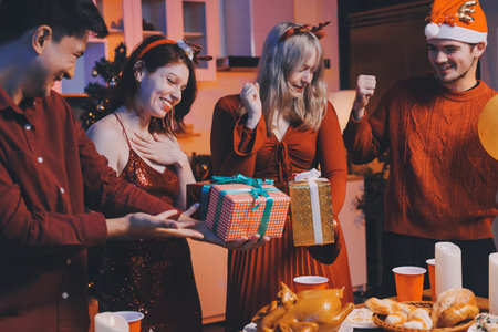 Group of young Asian man and women as friends having fun at a New Year's celebration, holding gift boxes standing by Christmas tree decoration, midnight countdown Party at home with holiday season.