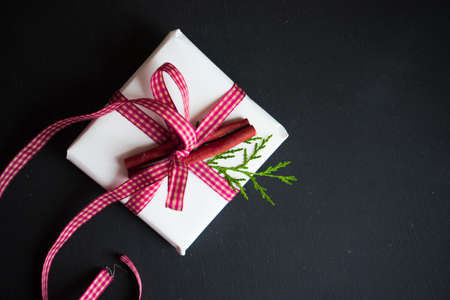 Gift box decorated with a cinnamon stick and a sprig of a Christmas tree.