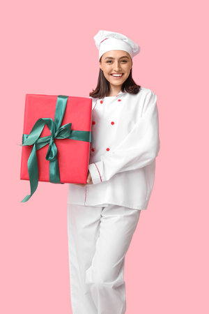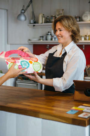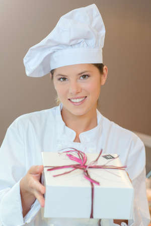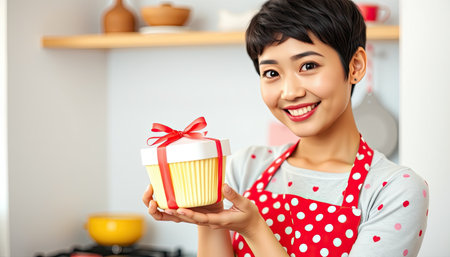 A smiling young woman baker in a red polka dot apron holds a cupcake shaped gift box with a red ribbon.