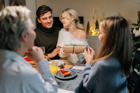 Happy family with daughter giving gift box with mother during dinner at home, celebration in xmas with children surprising parent with enjoyment at house, thanksgiving eve, Merry Christmas.