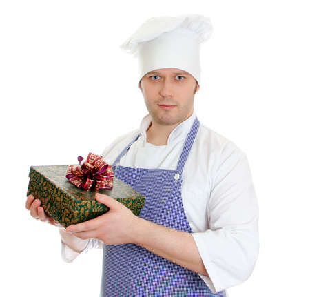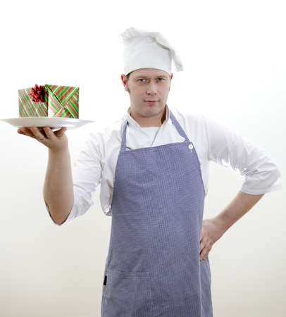 Family dinner at Christmas or New year, holiday food. Christmas cookies at man cook in kitchen in chef uniform and santa hat cooking
