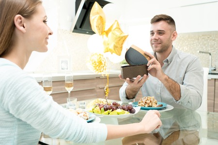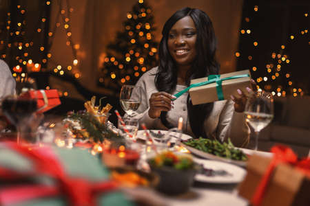 A female colleague amazed by New Year present she got from male colleague at company dinner in restaurant in a holiday atmosphere. Together, New Year, celebration