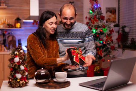 Couple celebrating christmas eve on video call conference with relatives and receiving gifts in holiday decorated kitchen. Man and woman feeling cheerful for seasonal celebration