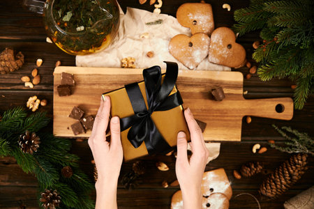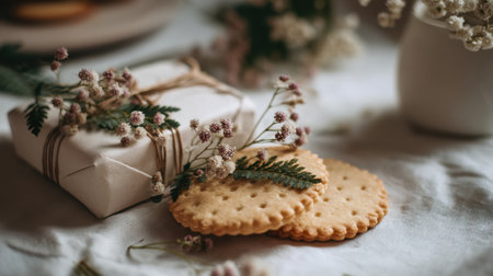 This charming composition features cookies and a beautifully wrapped gift adorned with dried flowers, creating a warm, inviting atmosphere perfect for celebrations.