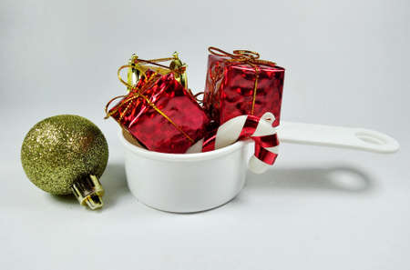 A frying pan with a golden bow wrapped around it sits on a wooden table. The background shows a decorated Christmas tree with red ornaments and a window with a view of the outside.