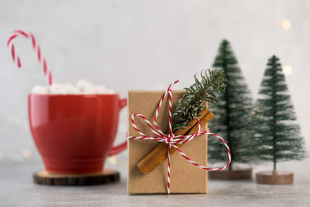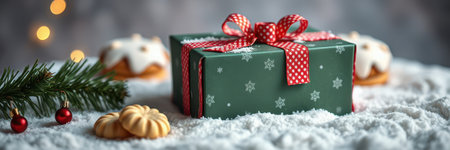 Holiday gift box on a snowy table with cookies and festive decorations for Christmas celebration