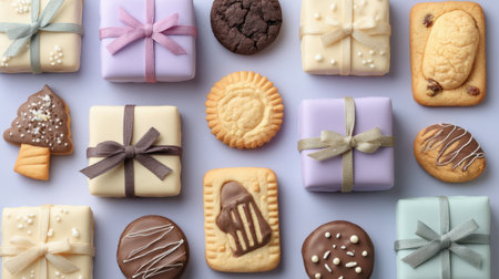 An appealing assortment of cookies and beautifully wrapped gift boxes create a delightful visual display perfect for celebrations and special moments.
