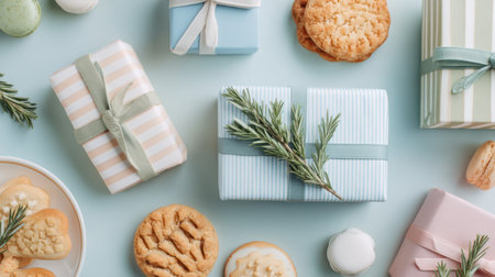 This image showcases beautifully wrapped gift packages alongside delightful cookies, creating a charming and festive scene perfect for celebrations and gatherings.