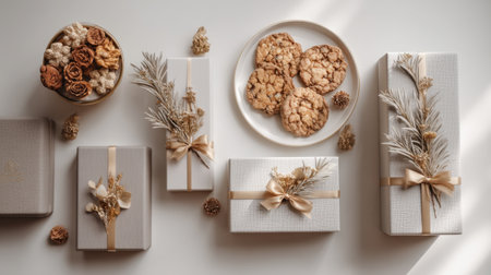 A cozy holiday scene featuring wrapped gifts, sweet cookies, and natural decorations on a soft linen backdrop. Ideal for festive inspiration and celebration ideas.