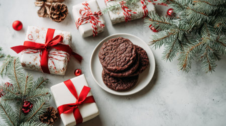 Delight in a cozy Christmas scene featuring decorated gifts, fresh pine branches, and delicious chocolate cookies on a plate, inviting warmth and joy.