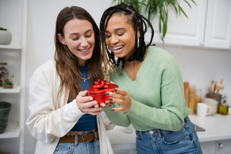 happy interracial and lesbian women holding red heart-shaped gift box with bow on valentines day
