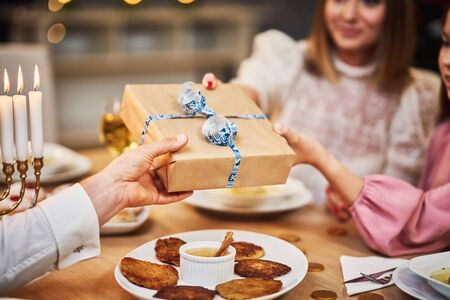 Hanukkah dinner. Family gathered around the table with traditional dishes