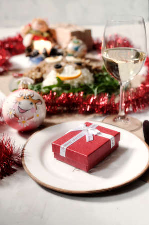 New year food. Food art. Bull shaped salad. Salad. New year 2021, Christmas 2021. Gift, champagne. Symboll of a chinese year. Table setting for a new year