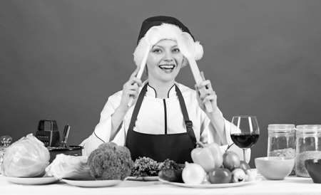 Try main meal. Best christmas recipes. Christmas dinner idea. Easy ideas for christmas party. Healthy christmas holiday recipes. Festive menu concept. Woman chef santa hat cooking hold wooden spoons