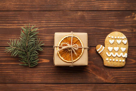 Fir tree branch, gift box with slice of dried orange and mitten shaped cookie on wooden background
