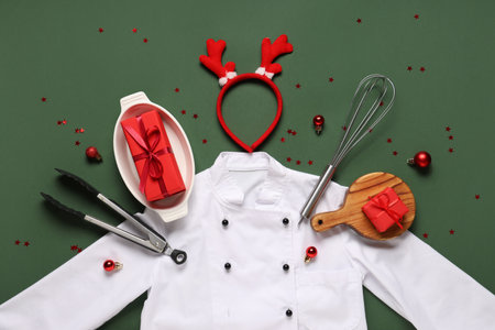 Chef's uniform with reindeer horns, utensils, gifts and Christmas decor on green background