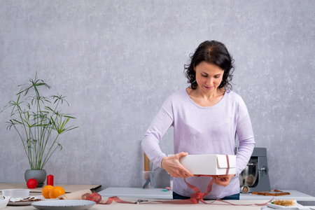 Beautiful girl dressed in a white shirt holding a gift in a modern bright kitchen