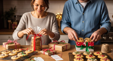 A happy couple enjoys packaging homemade cookies and gifts in a cozy kitchen setting. They are busy preparing baked goods for the festive holiday season.