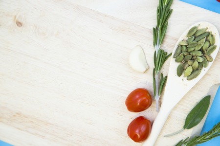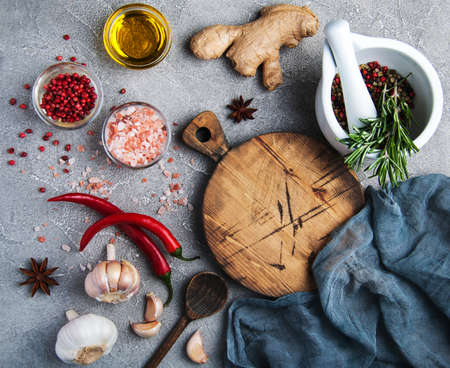 Cooking ingredients. Various spices and cutting board on wooden table. Top view