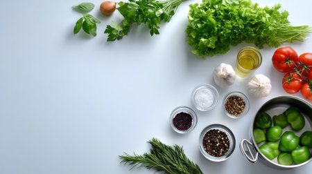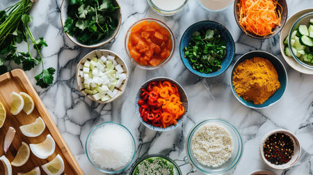 A detailed shot of fresh ingredients laid out on a kitchen counter, including herbs, vegetables, and spices, ready for cooking.