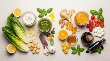 Assorted salad ingredients including lettuce basil tomatoes cheese oils and dressings arranged on a neutral background