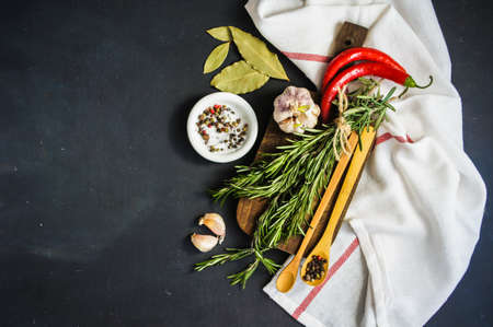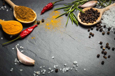 Herbs and spices on a graphite board