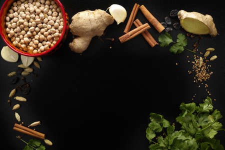 Indian spices, fresh coriander, ginger, garlic and dried cardamom, cloves, cinnamon on black background, copy space