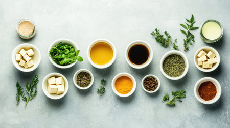 A stunning arrangement of fresh cooking ingredients displayed in bowls, showcasing vibrant herbs, spices, oils, and tofu, perfect for inspiring healthy culinary endeavors.